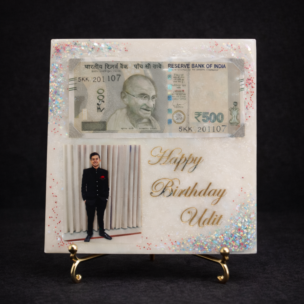 A personalised resin frame designed to combine a photo, currency display, and custom message in one elegant keepsake. Ideal for birthday gifting and special celebrations.