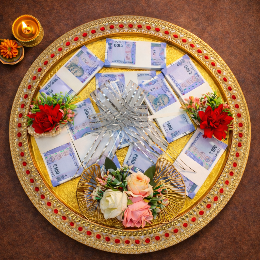 This decorative cash gifting tray is designed to make money gifting look organised and presentable during special occasions. The round platter style, combined with floral decorations and detailing, gives it a festive and elegant appearance.